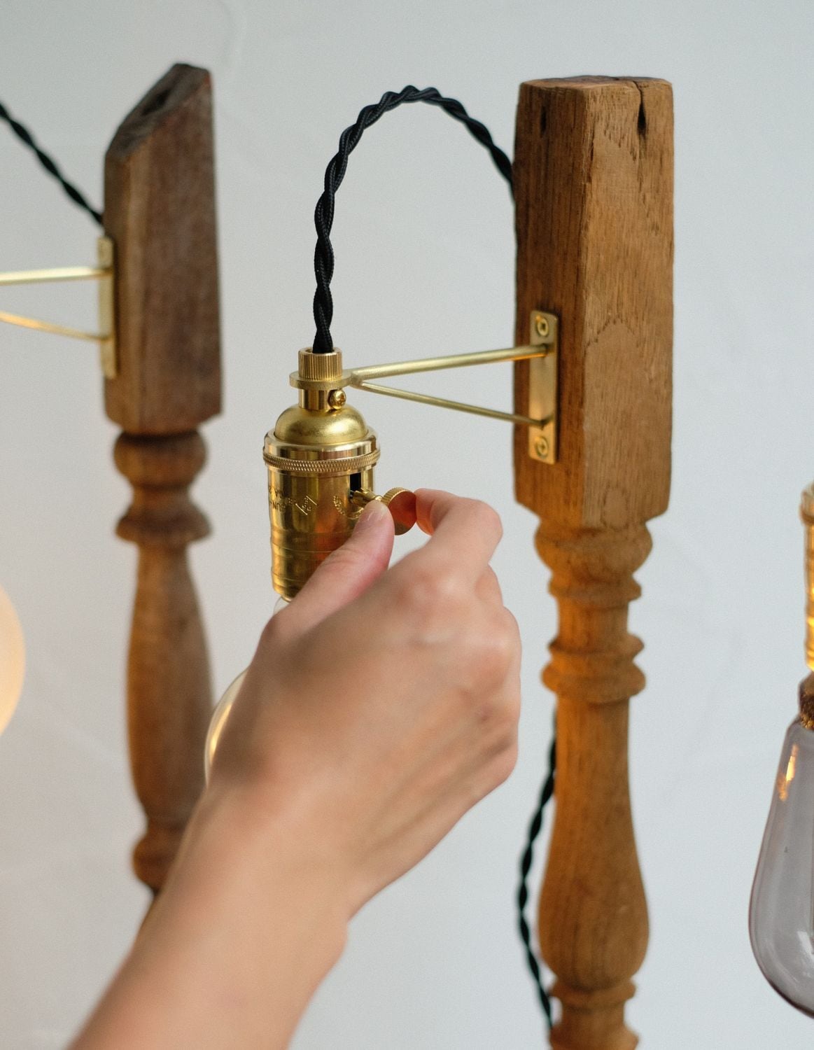 カチカチっとまわしてON/OFFの切り替えが出来るロータリースイッチのついたソケットを採用。クラシックなデザインと真鍮の質感が古材との相性もよく仕上がりました。